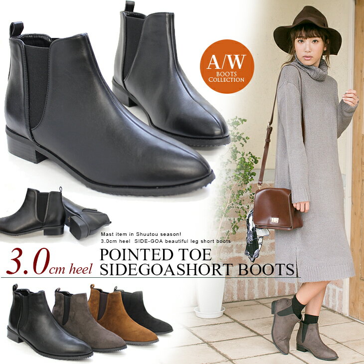 素材によって若干サイズ感が異なる場合がございます。 ご理解の上ご購入お願い致します。 3.0cmヒール 美脚サイドゴアショートブーツ 秋冬シーズンのマストアイテム! ポインテッドトゥ×足首に向けて細くなったシルエットは足を細く魅せる効果◎ アクセントになる左右についたサイドゴアで、脱ぎ履きしやすい。 トレンドなデザインに接地面も広く 安定したヒールで履きやすく歩きやすい! 【レディース ショート丈 ポインテッドトゥ サイドゴア ローヒール スムース スエード 安定感 ブラック 黒】 サイズ設定 S(23.0)/M(23.5-24.0)/L(24.0-24.5)/LL(24.5-25.0) 単位……