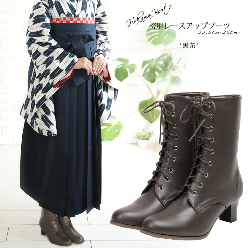 商品説明 袴ブーツで大正ロマンのモダンでかわいい卒業式スタイル 袴にブーツを合わせるスタイルは、明治から大正時代かけて流行し、 レトロモダンな着こなしを楽しむことが出来ます。 絶妙な高さのヒールとレースアップの美脚効果ですっきりと足元に。 レースアップなので、微妙な大きさの調節が可能です。 段履き慣れない草履よりも、ブーツの方が卒業式当日の慌ただしい中でも動きやすく、雨天の場合草履だと足袋の泥ハネが気になりますが、 ブーツなら安心です。 卒業式が終わった後でも普段のお洒落にも使えます。 シンプルで流行すたれの無いデザインなので、1足あると重宝します。 袴にブーツを合わせる場合は、ブーツが袴の裾……