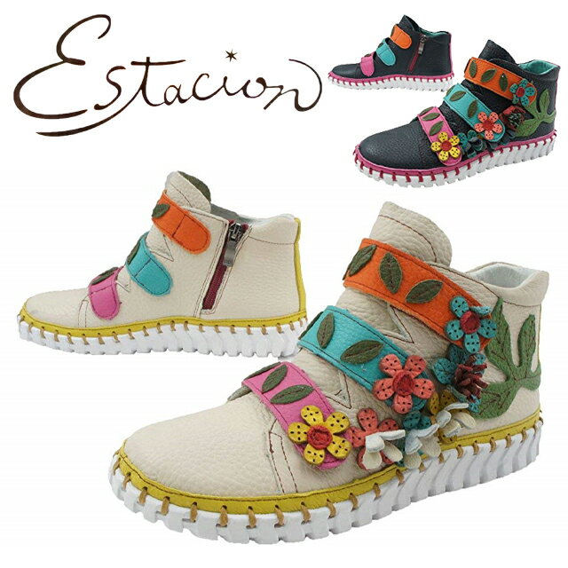 エスタシオン レディース スニーカーブーツ 本革 レザー Z502 ショートブーツ ベルクロ カラフル 花 フラワー コンフォート Estacion 送料無料![]()